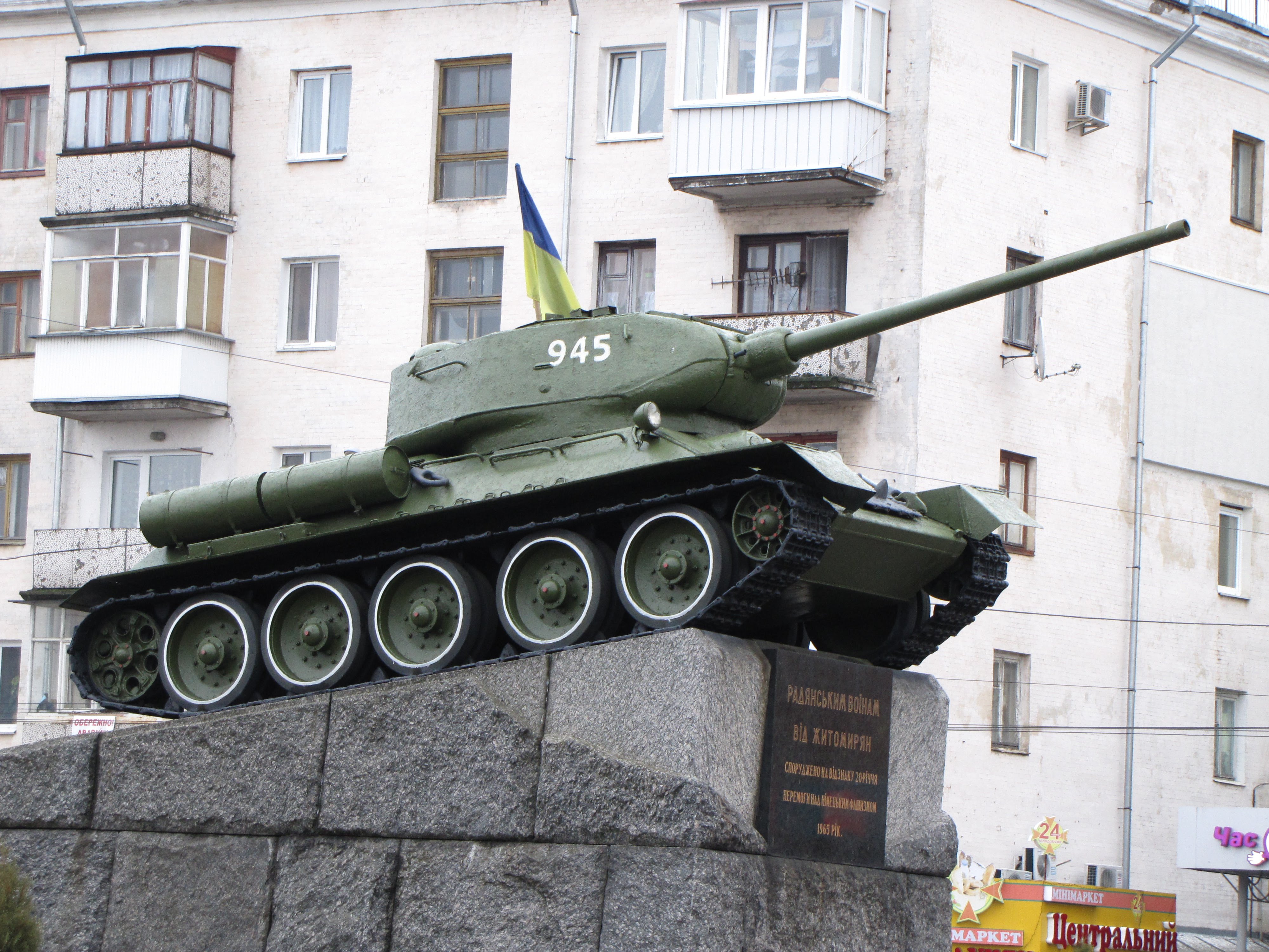 Коментар: Відкритий 8 травня 1965 року. На великих блоках житомирського граніту встановлений танк Т-34, який пройшов дорогами воїни. На постаменті текст: «Радянським воїнам від житомирян. Споруджено на честь 20-річчя Перемоги над німецьким фашизмом. 1965 г. ». Автор - архітектор А. Ф. Грінченко