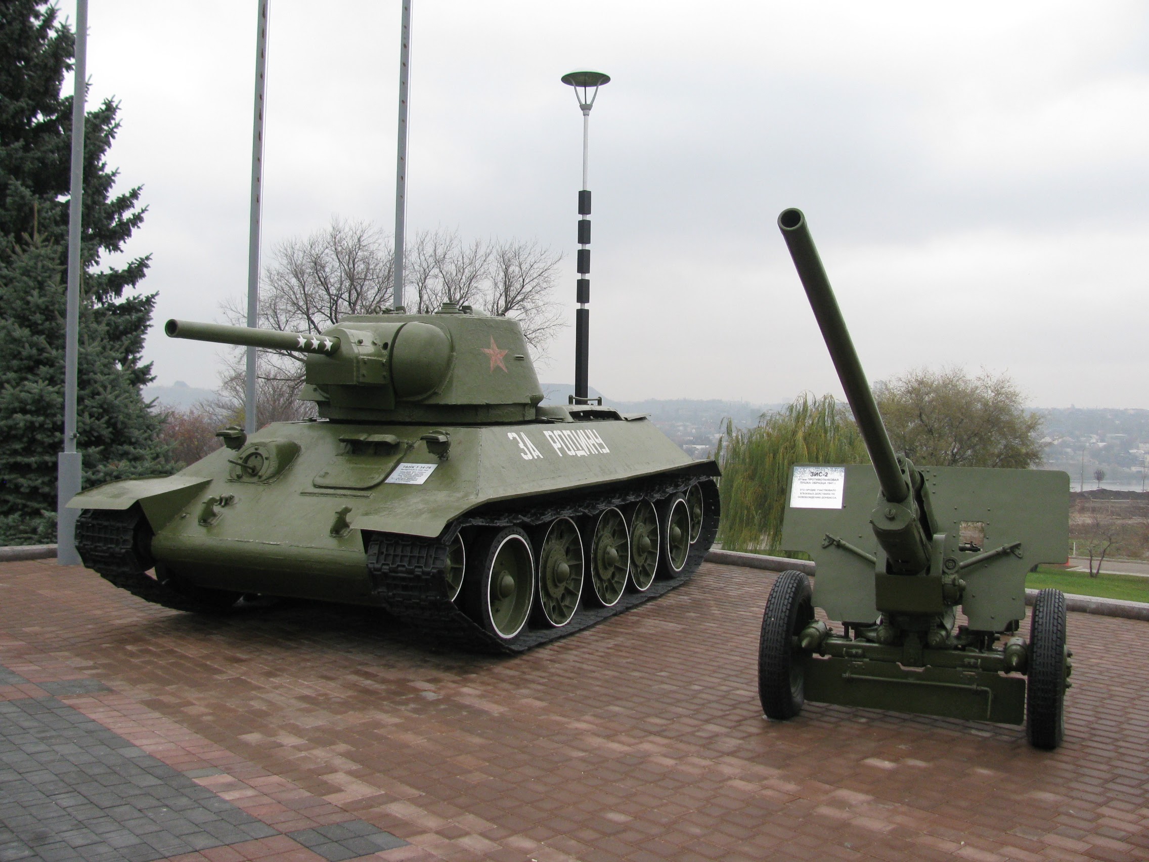 Характеристика: радянський середній танк періоду Другої світової війни, випускався серійно з 1940, був основним танком РСЧА до першої половини 1944, коли на зміну йому прийшов танк модифікації Т-34-85. Наймасовіший середній танк Другої світової війни. Танк Т-34 зробив величезний вплив на результат війни і на подальший розвиток світового танкобудування. Завдяки сукупності своїх бойових якостей Т-34 був визнаний багатьма фахівцями та військовими експертами одним з найкращих танків Другої світової війни. Танк Т-34 є найвідомішим радянським танком та одним із найбільш упізнаваних символів Другої світової війни. До теперішнього часу збереглася багато цих танків різних модифікацій у вигляді пам'ятників та музейних експонатів.
